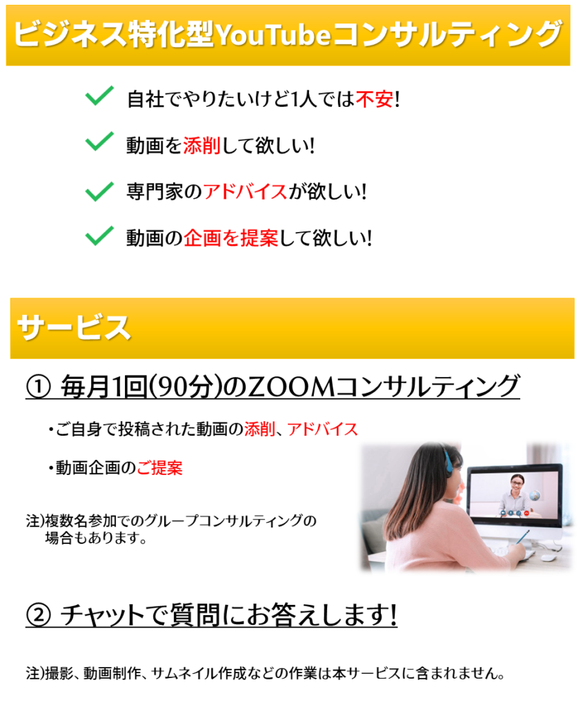 ビジネス特化型YouTubeコンサルティング まずは無料相談にてご要望を詳しくお伺いし、ご希望に添えるかどうか確認させていただきます。内容にご納得して頂いた後、正式にコンサルティング契約をさせて頂きます。 まずは下記からお申し込み下さい。